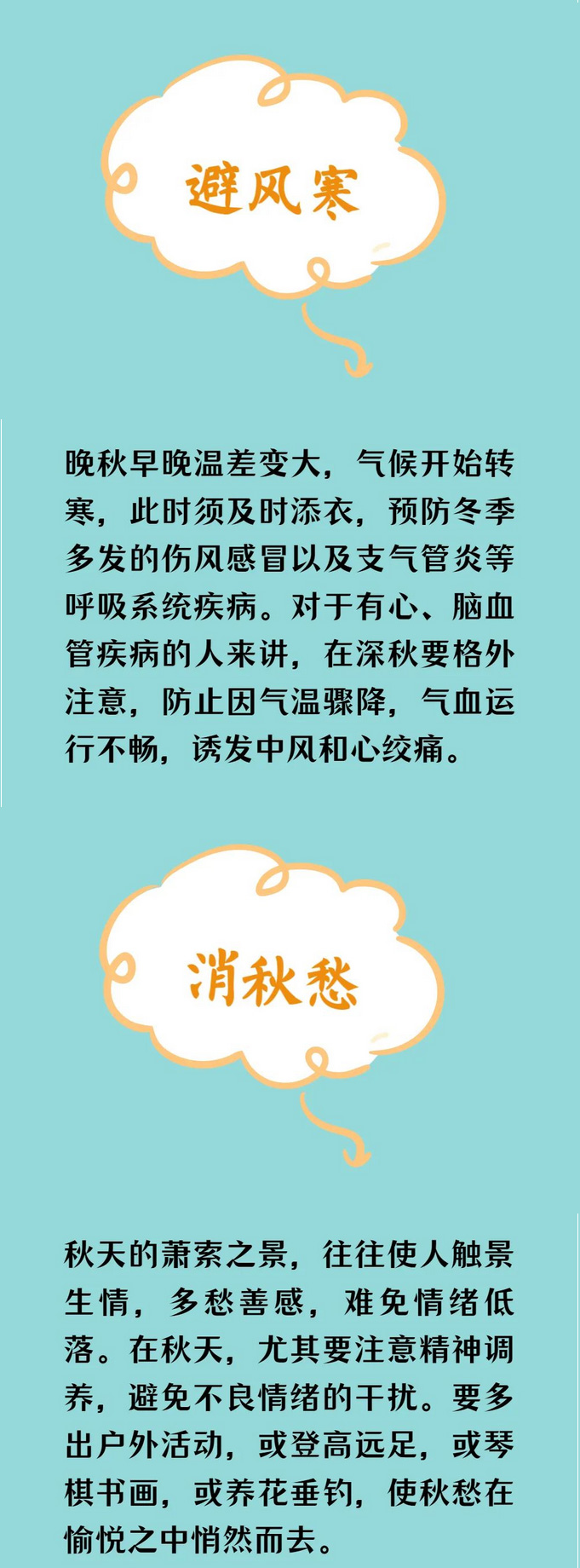 秋天,氣候由熱變涼,人體腠理由疏松轉為致密,陽氣開始潛藏于內(nèi)。秋風不是總送爽,在暑往寒來、氣候變化無常的“多事之秋”,養(yǎng)生務須趨利避害,順應天時,注意以下三個階段的不同。
